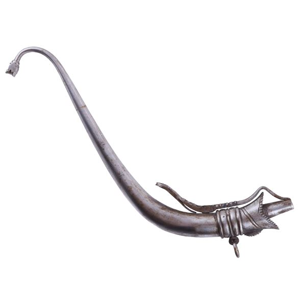 An Indian powder flask formed entirely of steel, with a long slender tapering body formed as a stylized fish, fitted with spring cut-off and a single