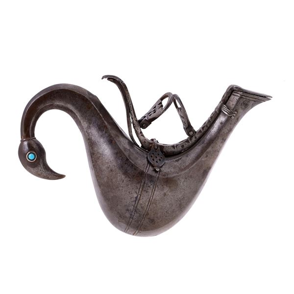 18th-century Persian powder flask with a tip cast as a bird head. The bird's eyes are set with turquoise. The spring is in working order. Iran, ...