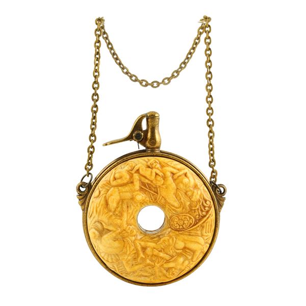 This item is probably a Victorian-era reproduction of a 17th-century-style German powder flask. The piece as a whole is in fine condition. The brass i