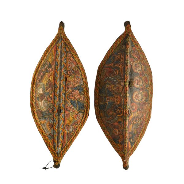 A pair of beautifully hand painted shields in the Ethiopian style depicting Biblical scenes. Probably 19th century. The handles on the back are in goo