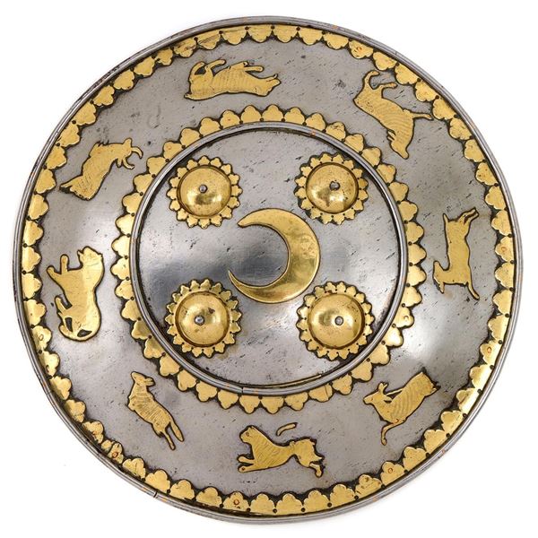 Circular, convex, iron hand-forged shield. At the center is a brass mount depicting the moon, four brass studs, and other brass mounts depicting tiger