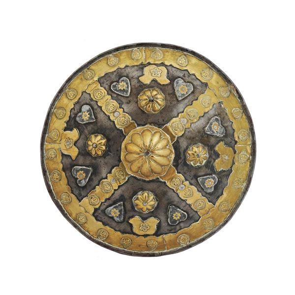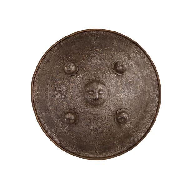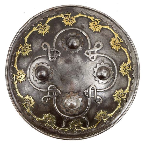 Shield dhal, North India, Rajasthan. Early 19th century. This circular-shaped shield is made of steel. Over this pattern and at the center, it display