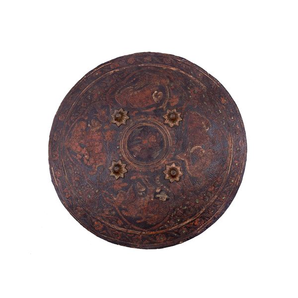 Fine 19th-century Indian Rajasthan embossed, hand-painted and lacquered leather Dhal shield. The slightly domed round-shaped shield is made of sturdy