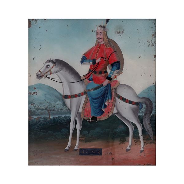 AN INDIAN REVERSE GLASS PAINTING, SULTAN ON HORSEBACK, 19 C