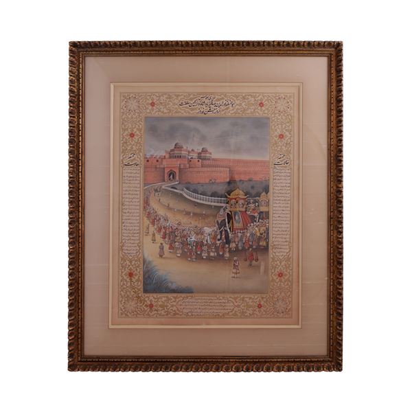 An important and unusually large Persian miniature painting depicting a procession entering the gates of a castle. The painting is decorated with exqu