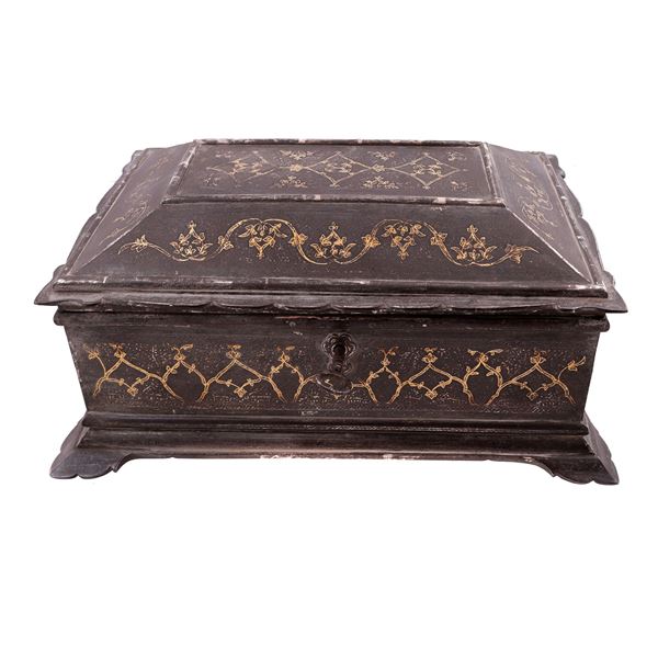 A small iron oval-shaped box. The box is decorated with gold inlaid and silver floral design and features a family crest depicting a crowned lion embl