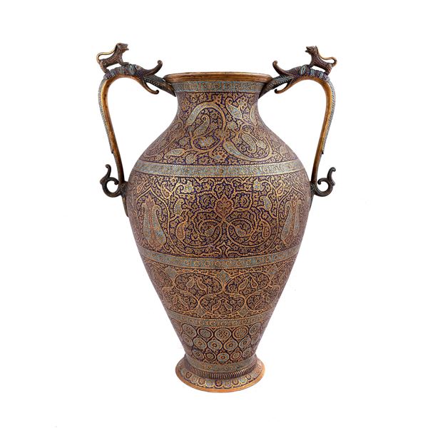 A LARGE INDIAN COPPER AND ENAMEL VASE, RAJISTAN, 19TH CEN.
