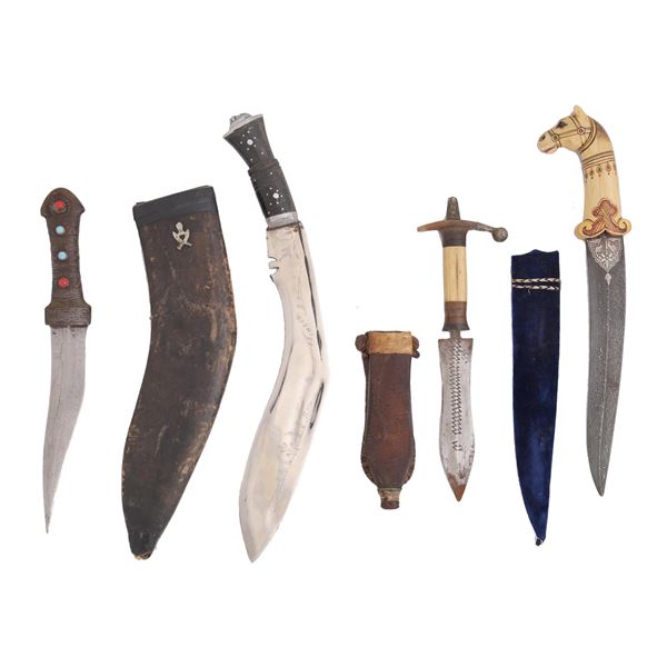 A variety of Eastern daggers, including a khukuri, two Indo-Persian Khanjar daggers including one with an ornate carving of a horse and velveteen scab