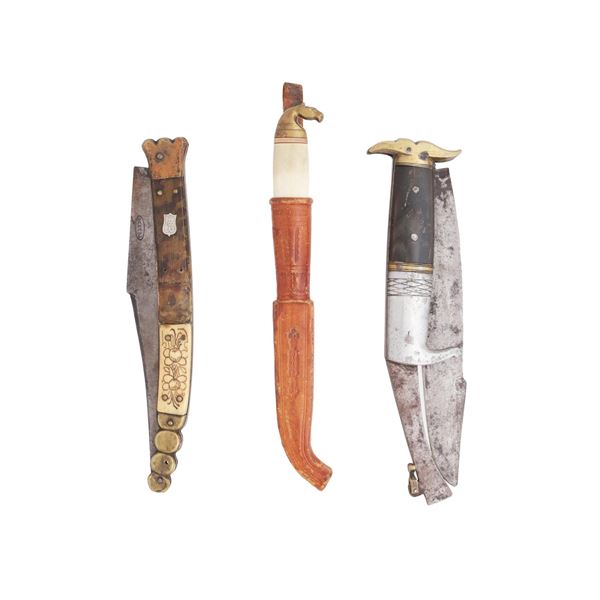 Two antique folding knives and an antique fixed blade knife of varying origin. One of the folding knives is from Rampur in Uttar Pradesh, India. The o