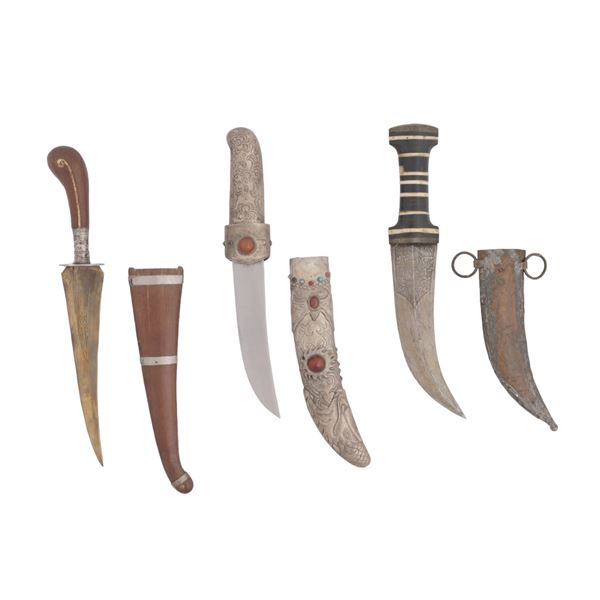 A set of three daggers consistent with the Ottoman style. The black handled dagger bears an Arabic inscription. Good overall, please refer to the ima