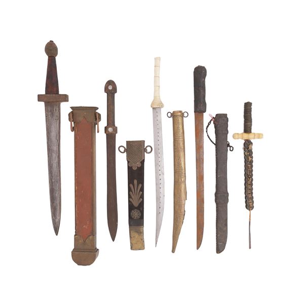 A set of five daggers of varying origin including a Chinese coin dagger, a stage or tourist reproduction sword reminiscent of a Greek Xiphos, a bone h