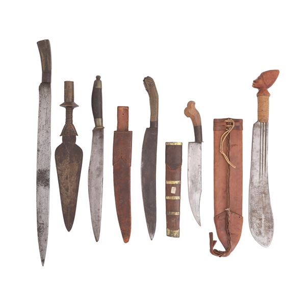 A set of five bladed weapons and one spear head. Some of the weapons appear to be of Caribbean origin. The machete type weapon with a head sculpture o