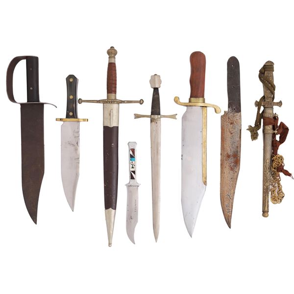 A set of eight knives, five of which are bowie knives of varying style, and three of which are quillon daggers of varying style. The smallest knife ha