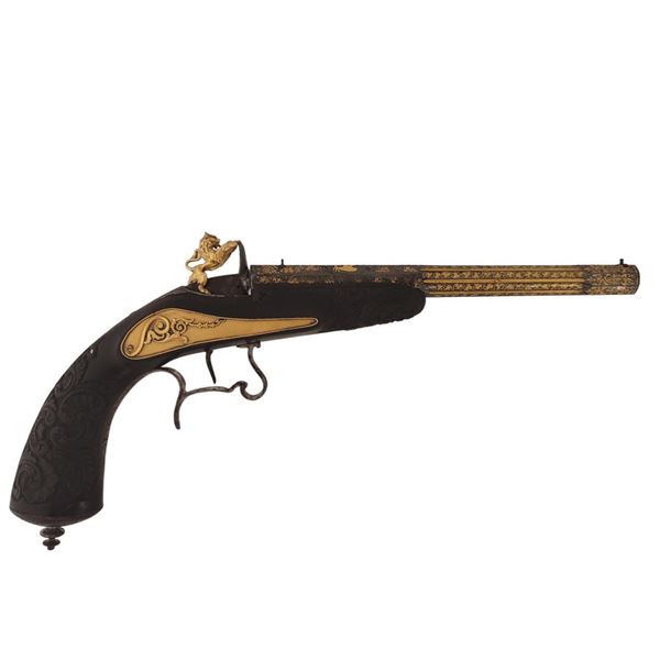 A magnificent rimfire single-shot presentation American target pistol. The bore is rifled .22 cal. The breech is decorated with fire-gilt Imperial eag