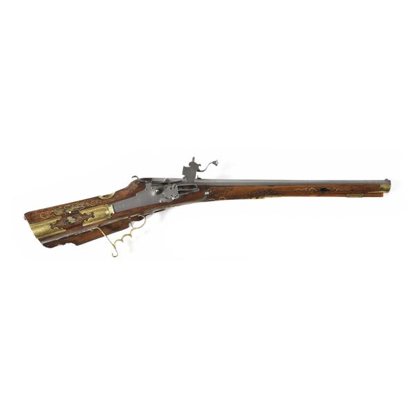 Wheellock rifle converted into a flintlock. The stock is mounted in brass and inlaid with mother-of-pearl and ivory. Decorated with a carved scene of