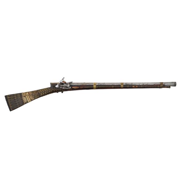 An Ottoman miquelet flintlock rifle with an octagon-shaped Damascus steel barrel decorated with silver inlay. The dark wooden full-stock barrel is ric