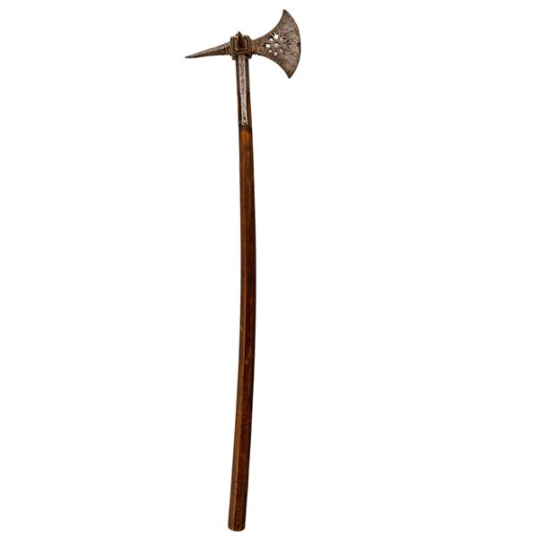 With a pierced axe blade and faceted back and side spikes. Plain-bordered sockets. Wooden faceted shaft. Very good, the shaft is slightly scratched,