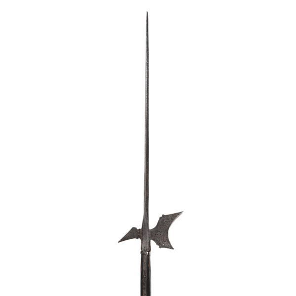A hand-forged halberd from 16th century Switzerland with a decorative head. The axe head is crescent shaped and has decorative protrusions. The fluke