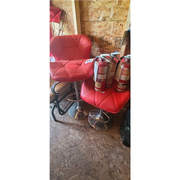 2-RED BARSTOOLS & 3 FULL FIRE EXTINGUISHERS