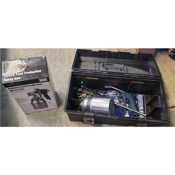 VAPOR SIPHON FEED SPRAY GUN w/ MAUNAUL IN TOOL BOX & ASSORTED AIR TIPS & NOZZLES VARIOUS LENGTHS & S