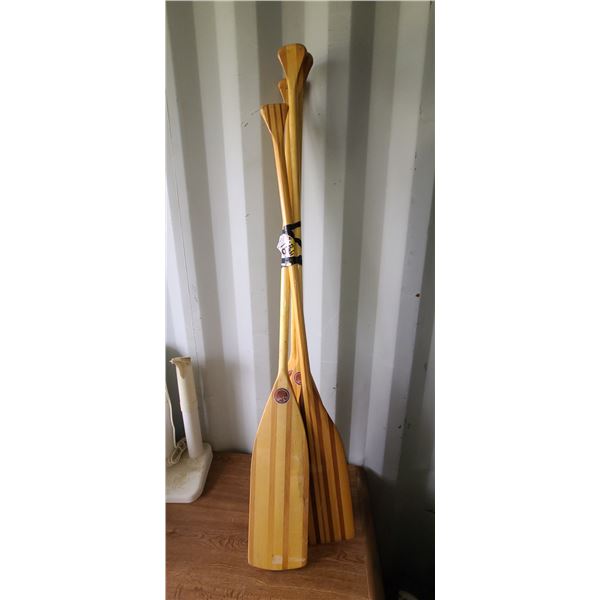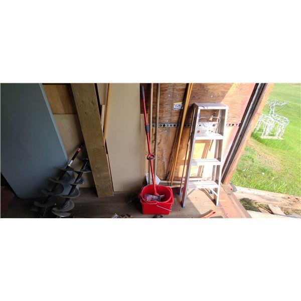 2 BROOMS, 2 SQUEEGEE, 4FT STEPLADDER 7 ASSORTED WOOD