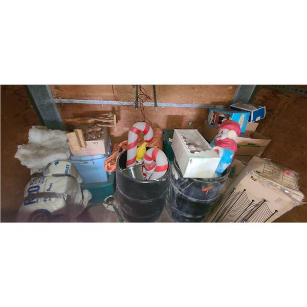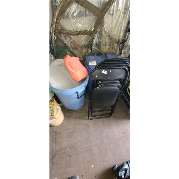 4 FOLDING CHAIRS, 2 GARBAGE CANS CHRISTMAS GOODS & POP-UP GREEN HOUSE