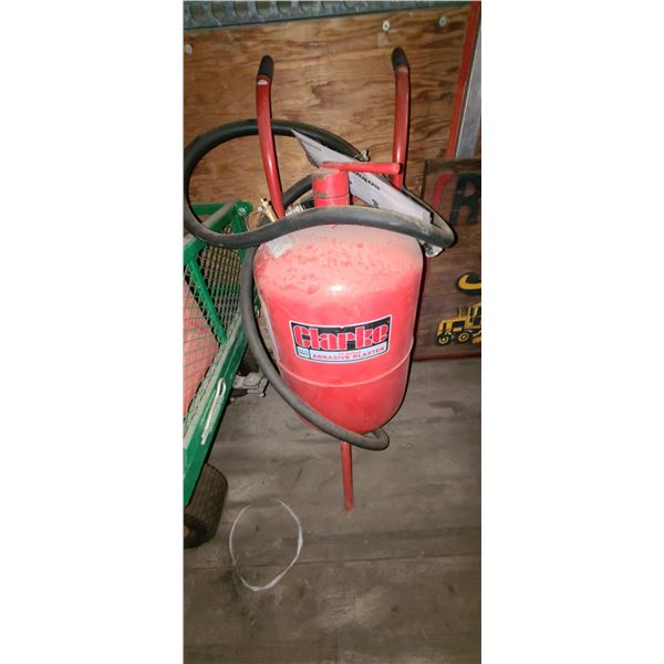 5 GAL. TANK W/ PUMP & PRESSURE GAUGE (FULL OF UNKNOWN) & PLASTIC TOOL BOX W/ MISC. GREASY TOOLS