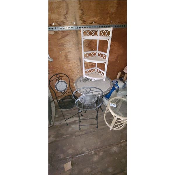 2- TABLE SETS (1 WICKER W/ CORNER STAND; 1 CAST IRON W/ 2 CHAIRS)