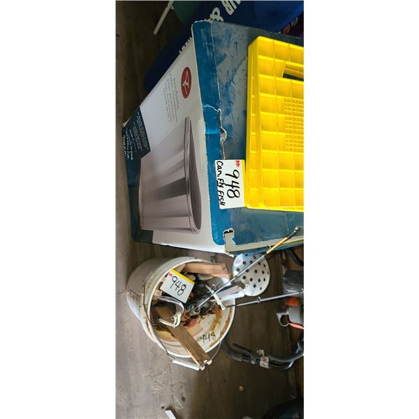 GARBAGE CANS (NEW) SS & PAIL OF ICE FISHING RODS & ACCESS.