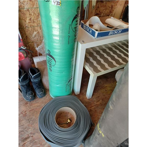 ROLL OF 4" RUBBER TRIM; ROLL OF FOAM UNDERLAY & ASSORTED TILE (APPROX. 3 BOXES)