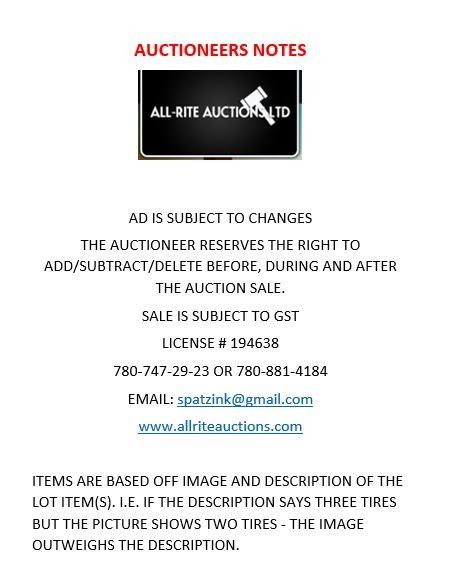 14. Arranged shipping are available and are made by All-Rite Auctions LTD. Shipping prices will be disclosed in your invoice. Alternatively, the bidder does have the option of picking up the lot(s) won from the sale site, within 48 hours.