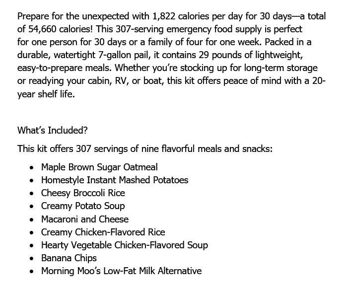 Perfect for a single individual for 30 days or a family of four for a week. This kit ensures your household is prepared for natural disasters, extended power outages and other emergencies.