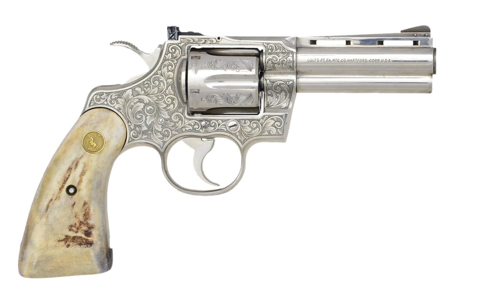 Cal. 357 Mag. S# 36652E. Bbl. 4" w/ full lug & VR. Serrated ramp front sight w/ square notch adj. rear sight. Action has full coverage foliate scroll hand engraving w/ punch dot background. Cyl. & left side of bbl. have highlights of matching scroll. Custom 2 Piece extension stag grips w/ Rampant Colt medallions having a 1/2" wood block at bottom. 1976 Mfg. CONDITION: over 98% custom nickeled finish. Grips show light wear. Bore retains sound rifling. PROVENANCE: Collection of Alan Bradley Shepherd. (20-4068/DS). MODERN. $5,000-8,000.
