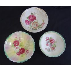 6 5 1/2" ROSE PATTERNED BOWLS WITH BROWN TRIM AROUND RIM. 1 7" PLATE WITH PEARL LIKE GLAZE. NO MARKINGS. FAIR CONDITION. Est Value $5.00-1...