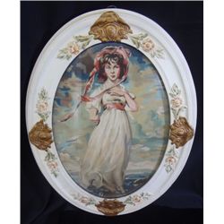 VINTAGE PICTURE AND FRAME. PICTURE GLASS IS DOME GLASS WHICH IS HARD TO FIND. THE OVAL FRAME IS HAND PAINTED. THE WOOD IS CRACKING WITH AGE STAINS. Es