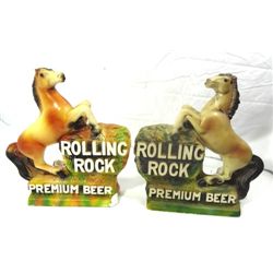 2 Rolling Rock Beer Advertising Chalkware Mustang Sculptures with some damage. One has a been cracked and repaired on the neck and chipped on the nose