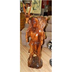 HAND CRAFTED SOLID TEAK CARVING - NATIVE WITH GAZELLE APPROX. 3' TALL