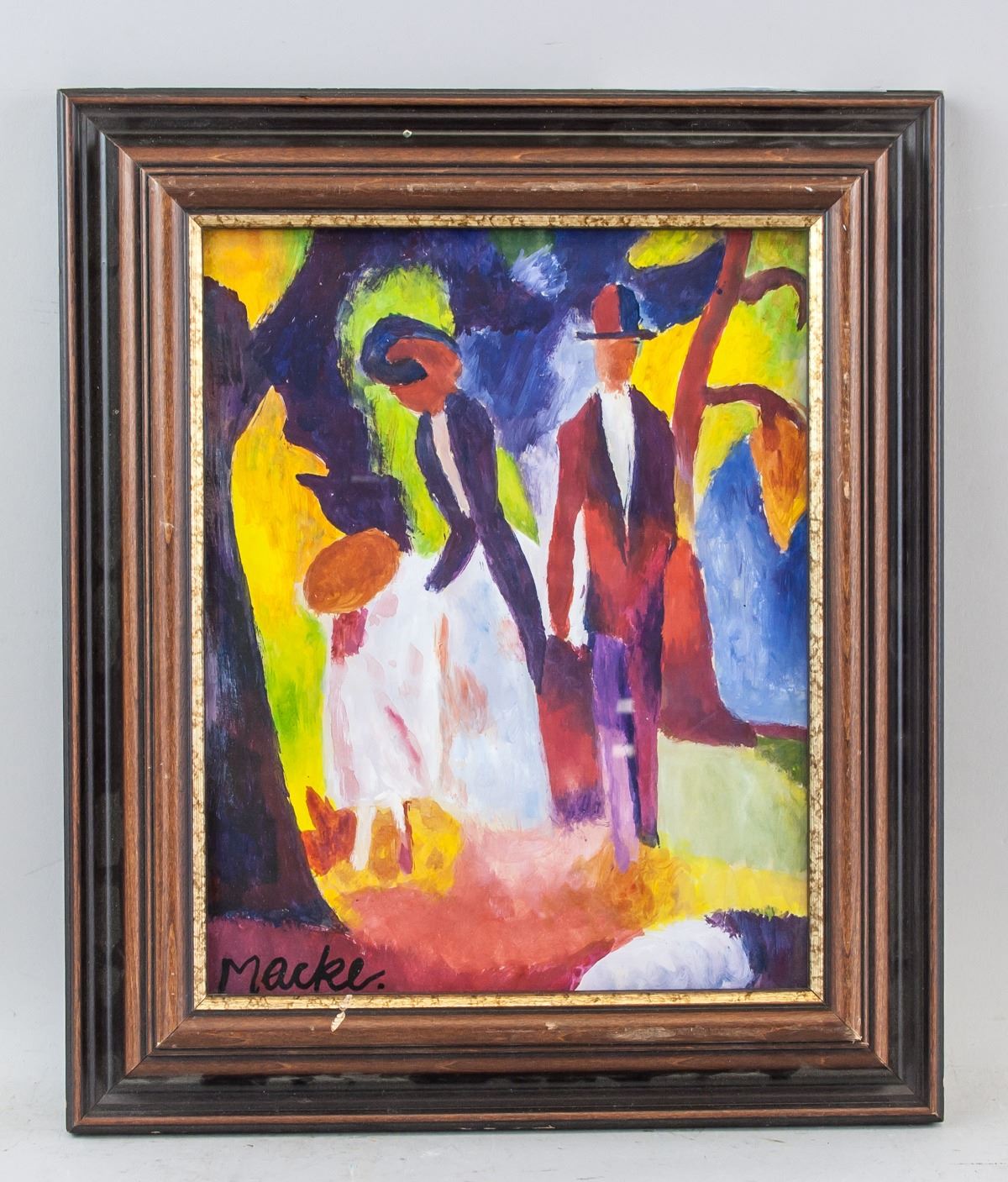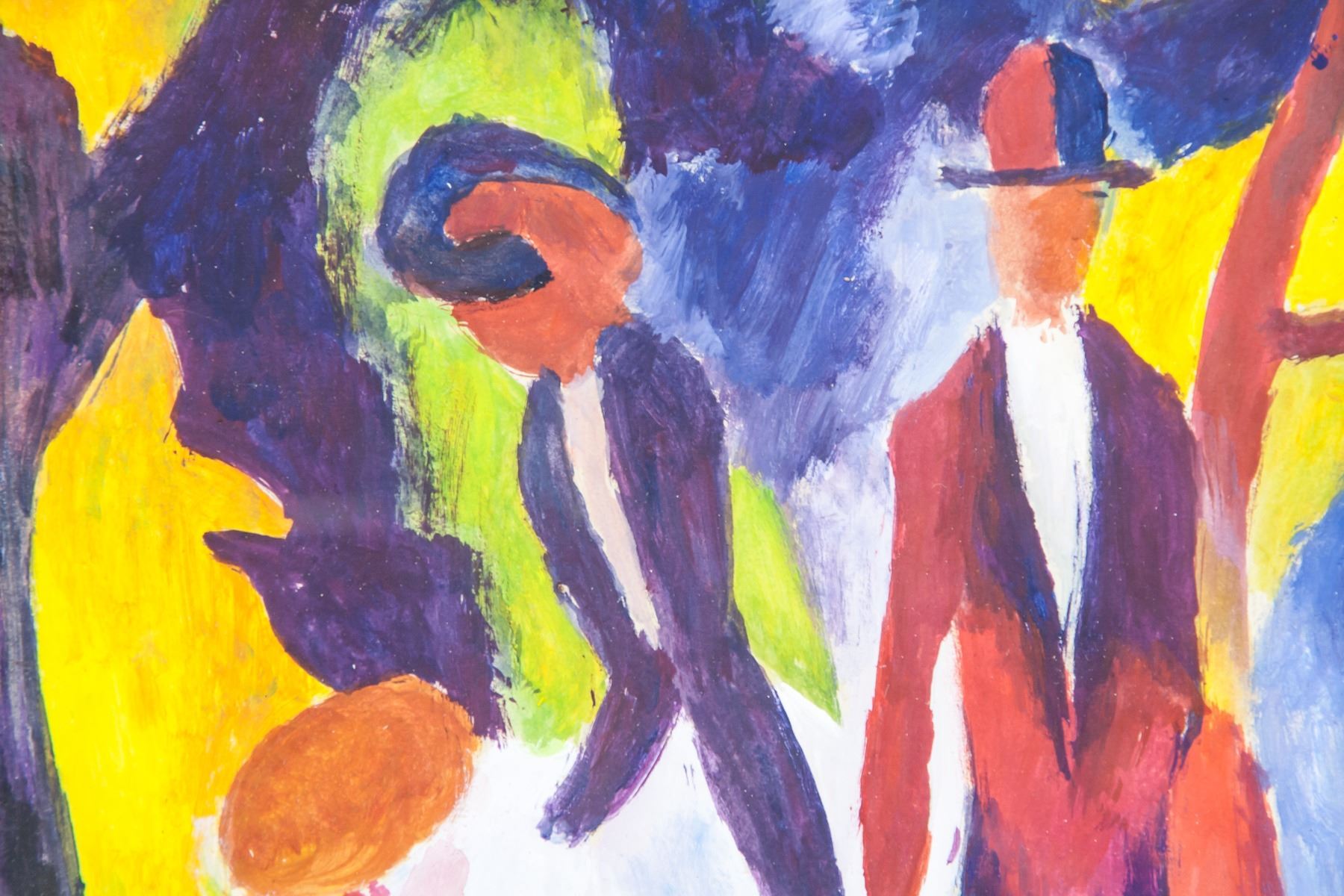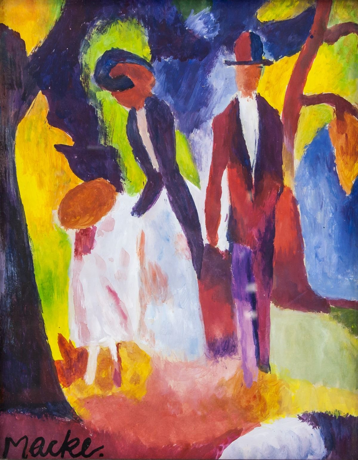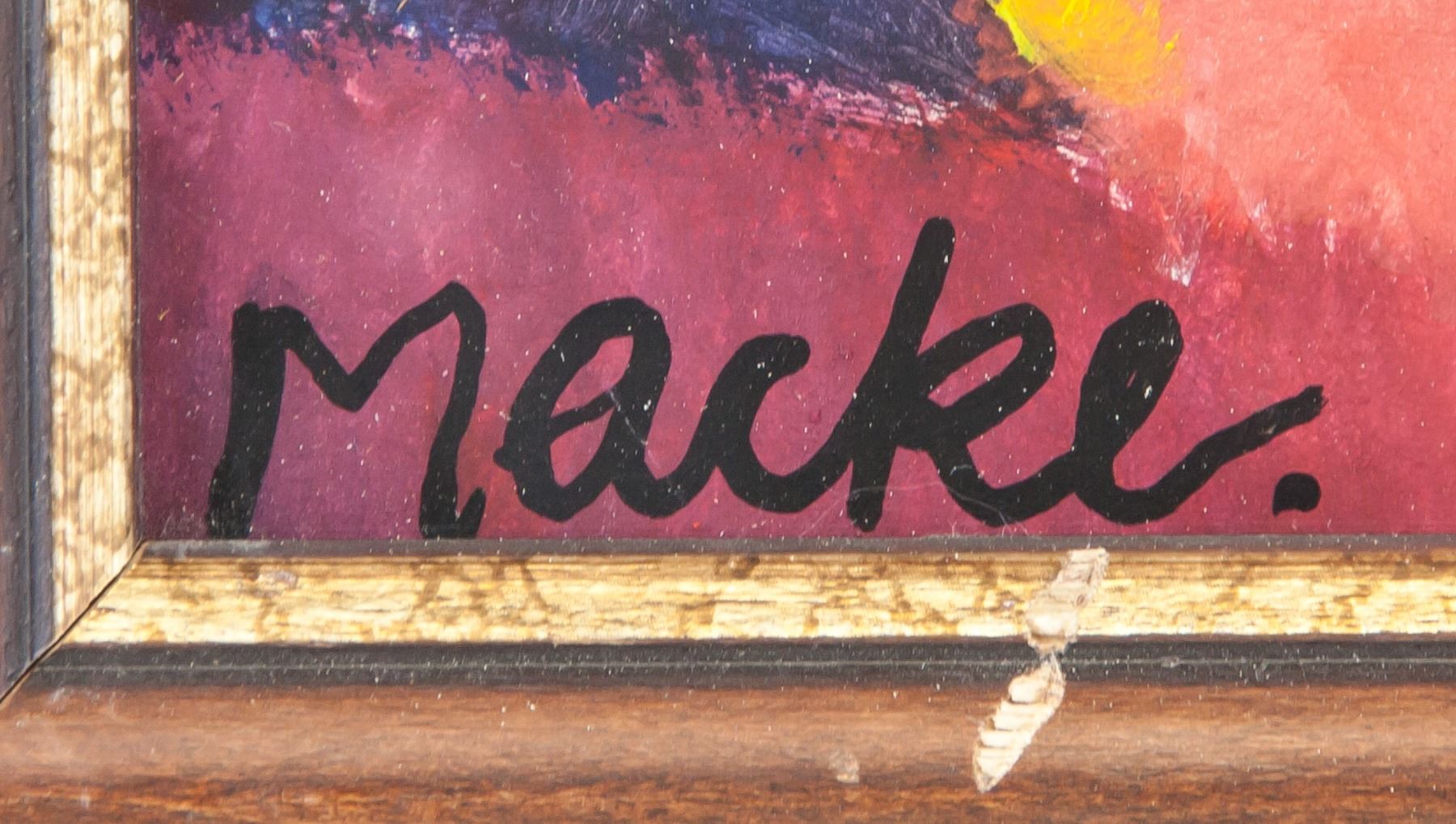 Gouache on paper, framed. Featuring a portrait in vibrant colors. Signed and attr. August Macke (German, 1887-1914) on the lower left corner. Gallery stamp marked on verso. 24 x 19 cm (9.4 x 7.4 inches). Frame size: 33.5 x 28 cm (13.2 x 11.0 inches). August Macke was a German expressionist painter who was a member of Der Blaue Reiter (The Blue Rider), a group that included Wassily Kandinsky and centered on the idea of expressing the spiritual through art. Macke was influenced by travels and encounters in Switzerland, Paris, Italy, the Netherlands, and Tunisia, and he cycled through styles including impressionism, futurism, fauvism, and cubism. The artist developed an oeuvre that combined many of these styles into bright, planar paintings featuring natural landscapes of rolling hills and turn-of-the century life. After his death during World War I in 1914, fellow Blaue Reiter member (Franz Marc) praised Macke in his obituary as "the one who gave colors the brightest and purest tone of us all.” PROVENANCE: Southern Ontario estate