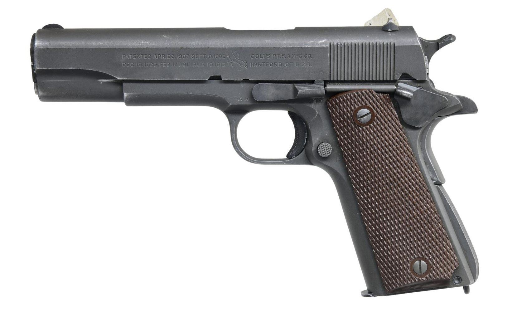 AUTO PISTOL. Cal. 45 ACP. S# 856518. Correct features include a 5" Type 6 bbl., Type 7 Coltwood grip panels, Type D hammer, Type C safety lock tab, long tang grip safety, short trigger, Type C mag. release lock, Type B recoil spring guide, and Type B recoil spring plug. Incorrect parts include a non-matching Colt 1911A1 slide with the S# 856765 stamp on the back and a replacement extractor. The slide has "P" firing proof (Type B front and rear sights), a Type 4 arched grooved mainspring housing, and a Type C slide lock. MAGS: 1 incorrect two-tone 7 rd. mag. with commercial markings "COLT / 45 AUTO." UNATTACHED ACCESSORIES: Colt factory letter detailing that the gun was originally shipped from the factory on November 30, 1942. CONDITION: good parkerized arsenal refinish with light cycling wear, light edge wear, and scratches from function and assembly. Rear sight has small scattered dents. Fairly faded mag. with patina and peppery oxidation. (23-5450/MD). CURIO. $900-1,400.