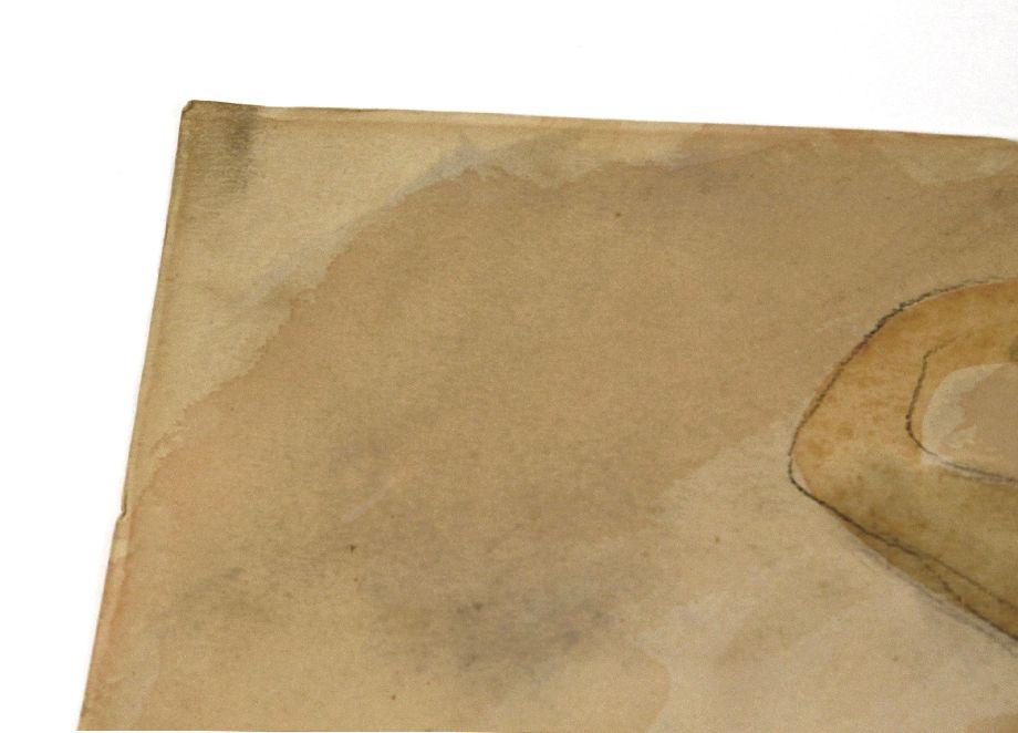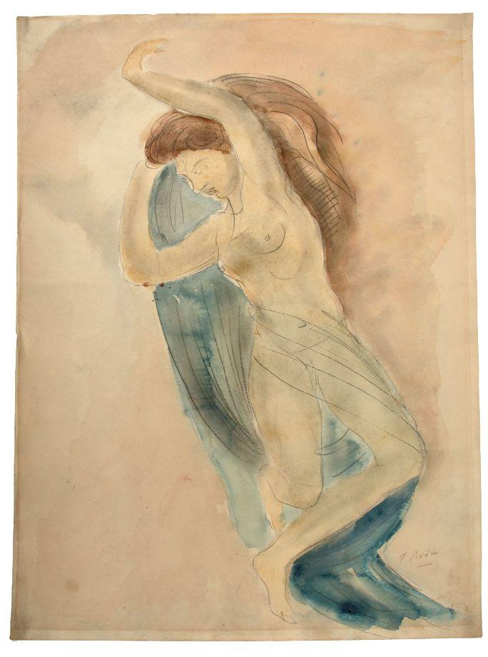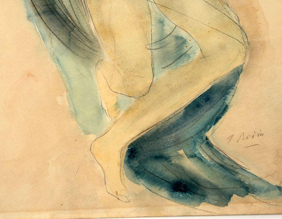 Image size 17x23 inches. Original pencil and watercolor on paper by Auguste Rodin (French, 1840-1917) depicting a female nude with a veil of blue. Signed "A Rodin" in pencil in lower right. Some tape residue at corners