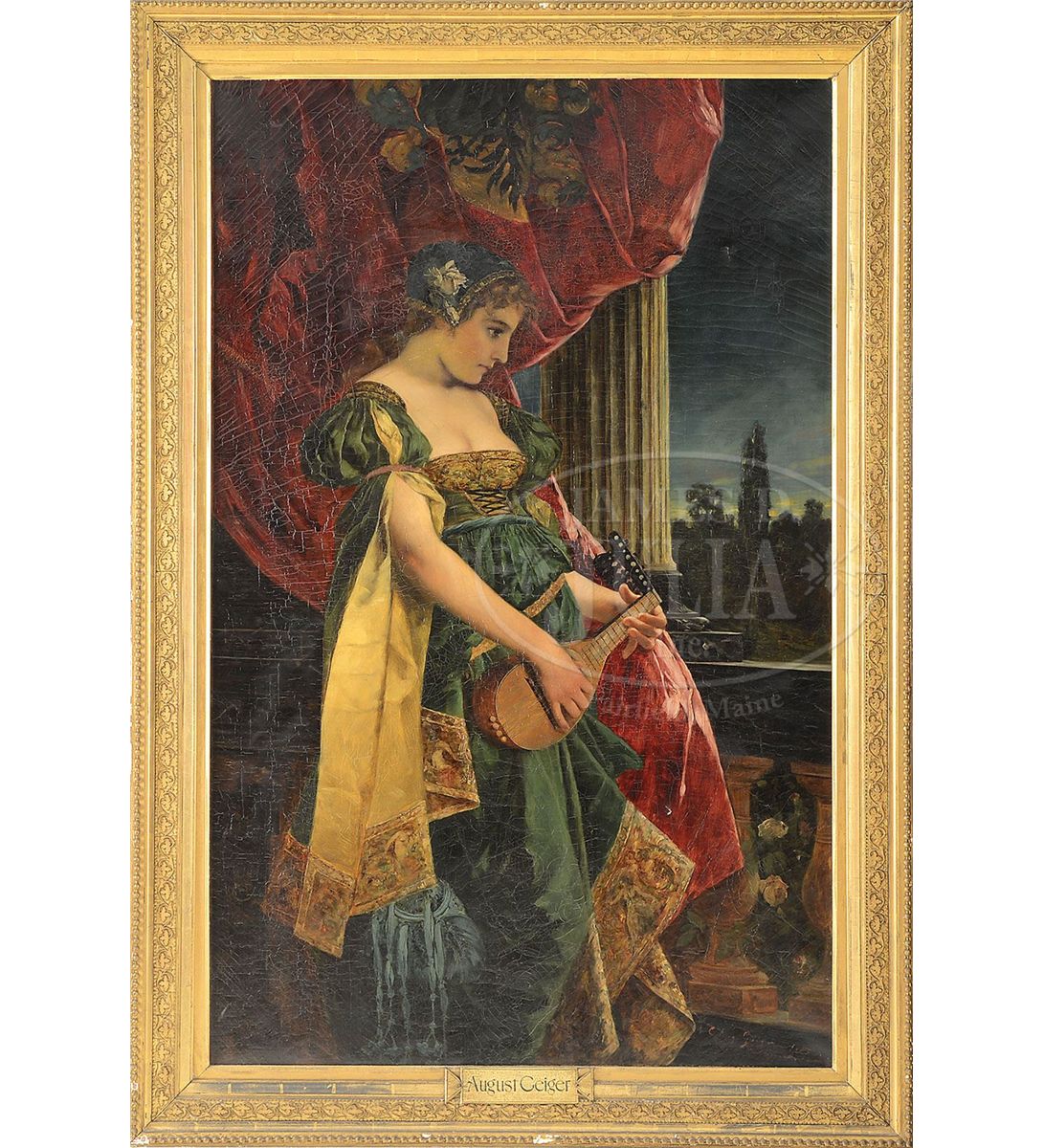 Oil on canvas Housed in a wide gilt original liner having a D.B. Butler & Co. New York label on verso Signed lower right "C. Aug. Geiger 1883 Munchen" SIZE: 53-1/2" x 33-3/4". Overall: 61" x 41-1/2". PROVENANCE: A fine Augusta, Maine estate. CONDITION: Wide craquelure, one small patch to reverse, small puncture in sky, some restoration with inpainting. 9-29216