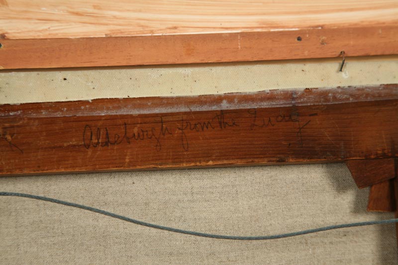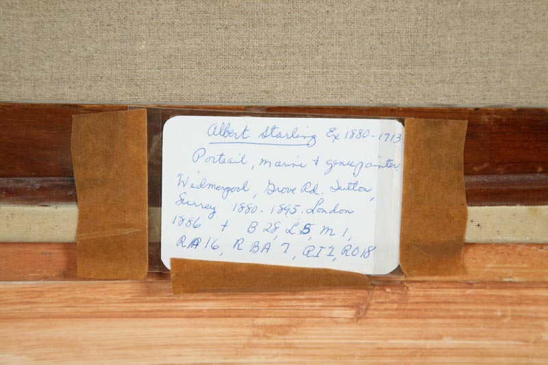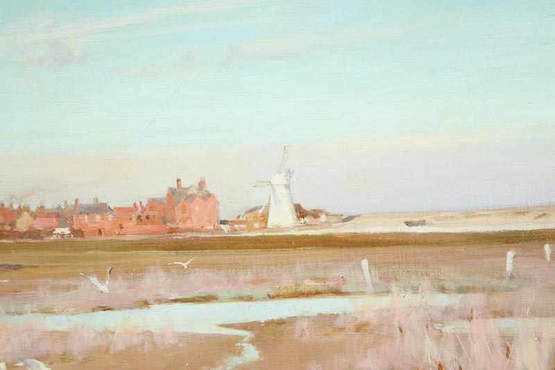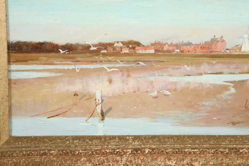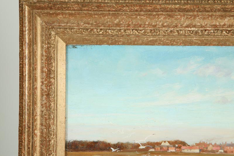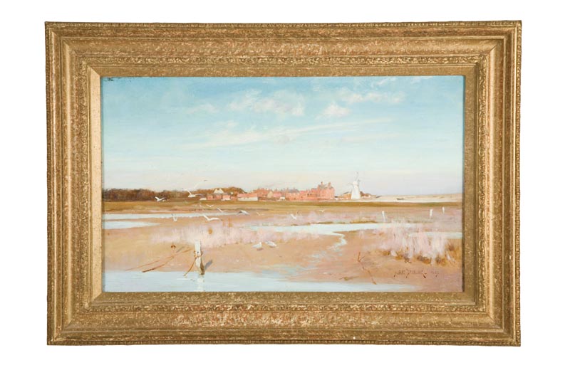 Oil on canvas, signed and dated 1887 lower right. Beach scene with the Auldeburgh windmill in the background. Imperfections. 12 1/4"h. 20"w., in a modern gilt frame, 17 1/2"h. 25 1/2"w. Sold at Brunk Auctions (North Carolina), March 2008, lot 390.