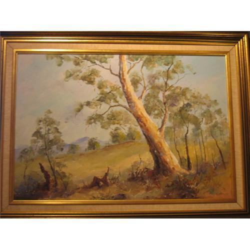This period oil painting is titled, "The Old Gum". It was purchased in Australia in the 1950's. A true depiction of the Australian outback by a fine artist.