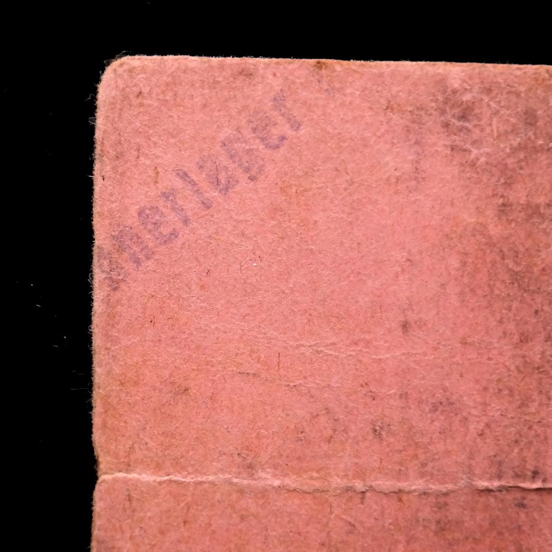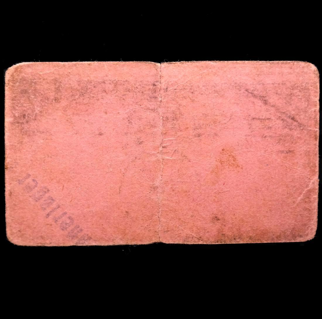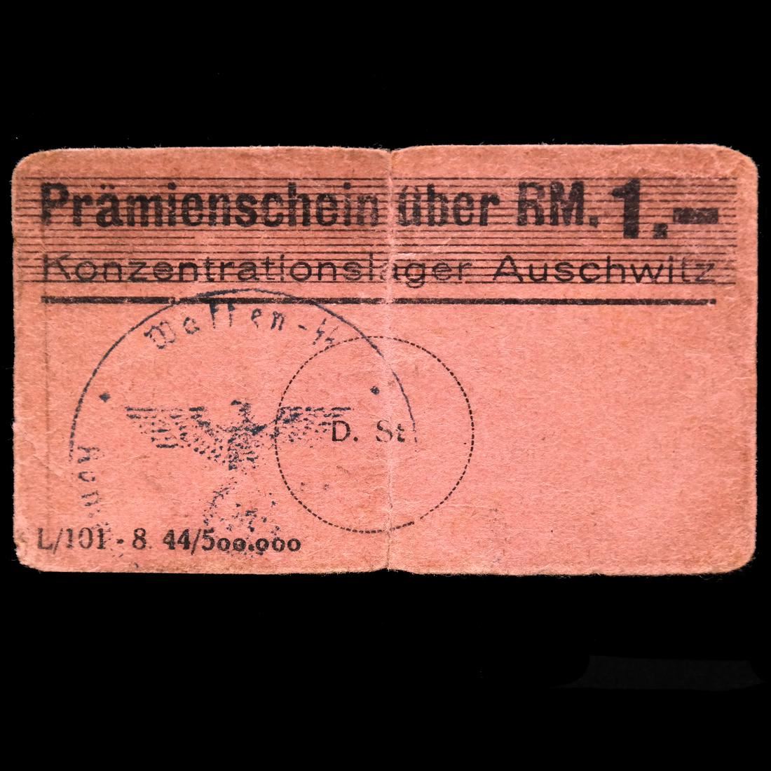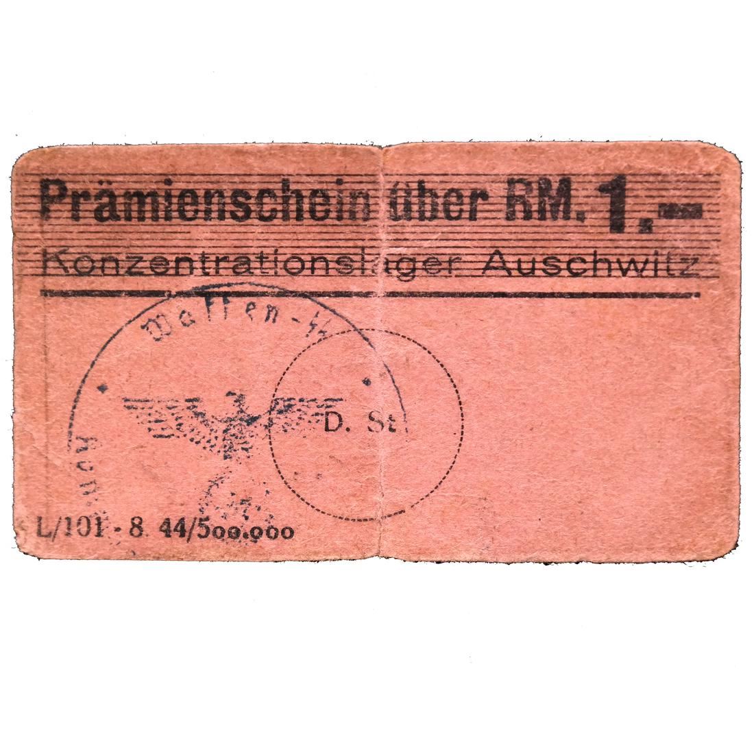 Prmienschein ber RM. 1.- / Konzentrationslager Auschwitz on light magenta card paper with Waffen SS control handstamp, partial Mnnerlager Birkenau handstamp on reverse, measures approx 74 by 44mm, vertical crease at center, some edge tears, rounded corners and soiling, Fine.