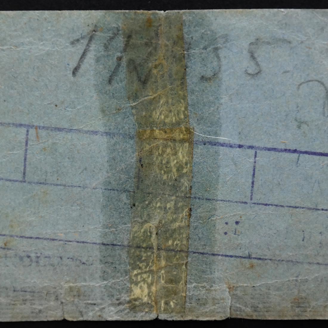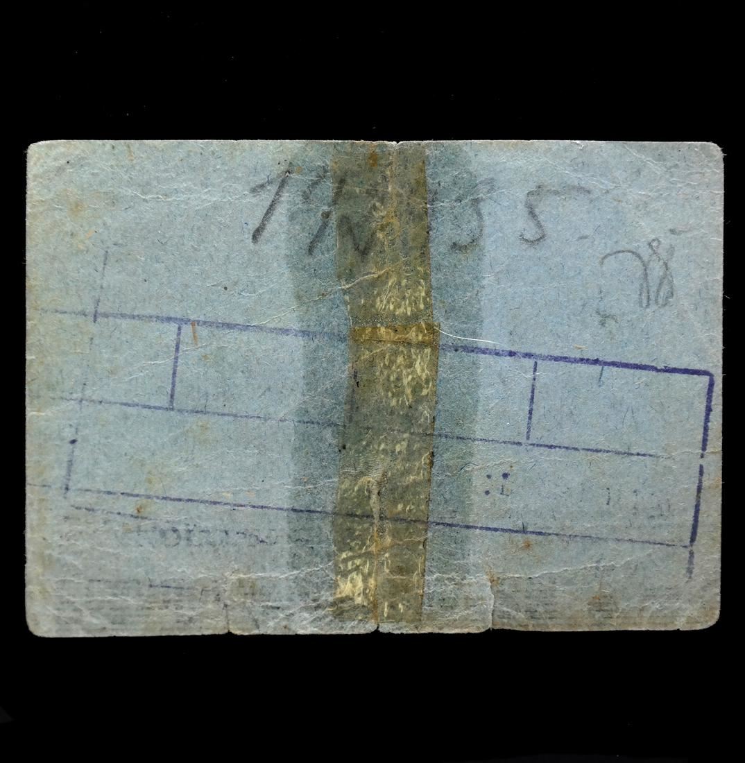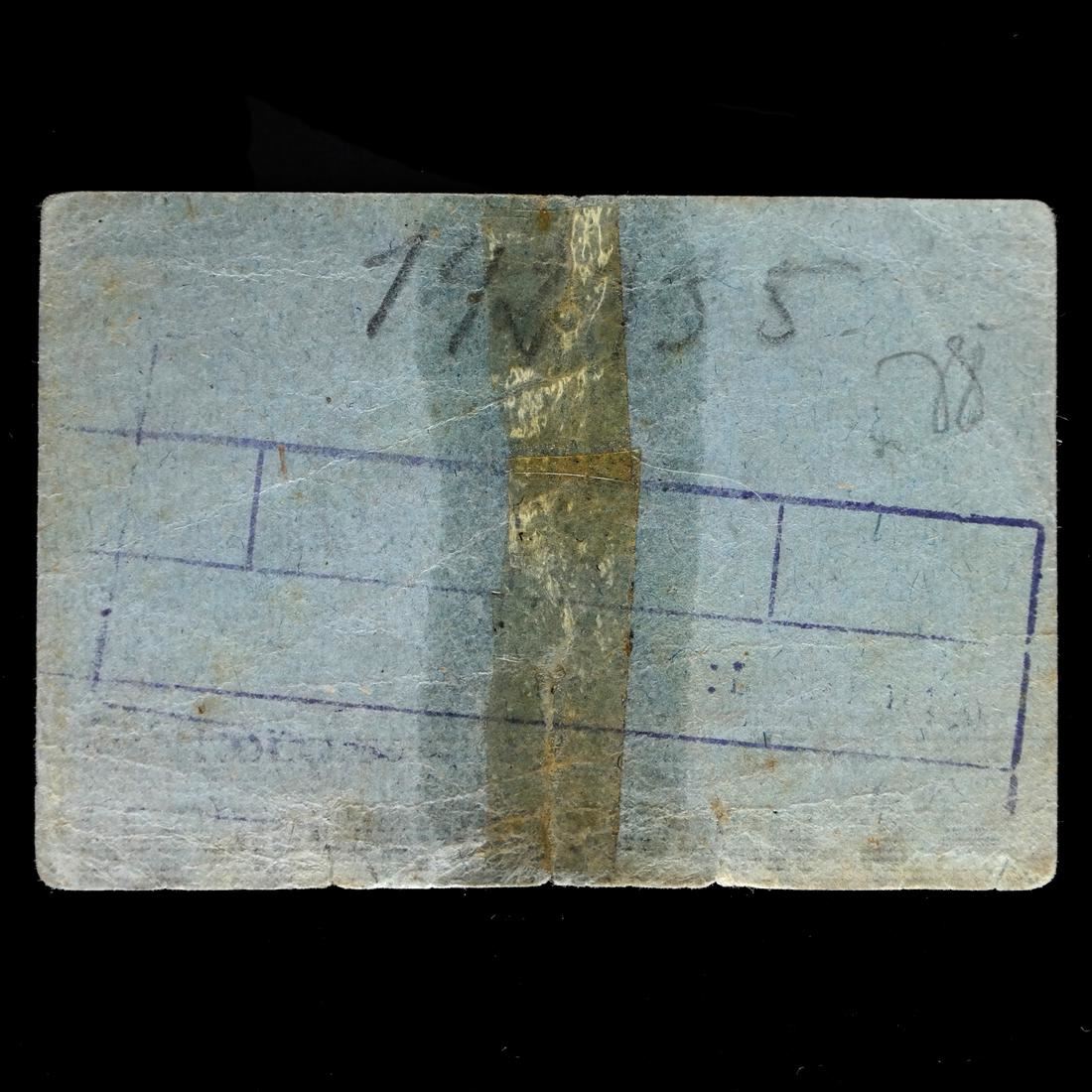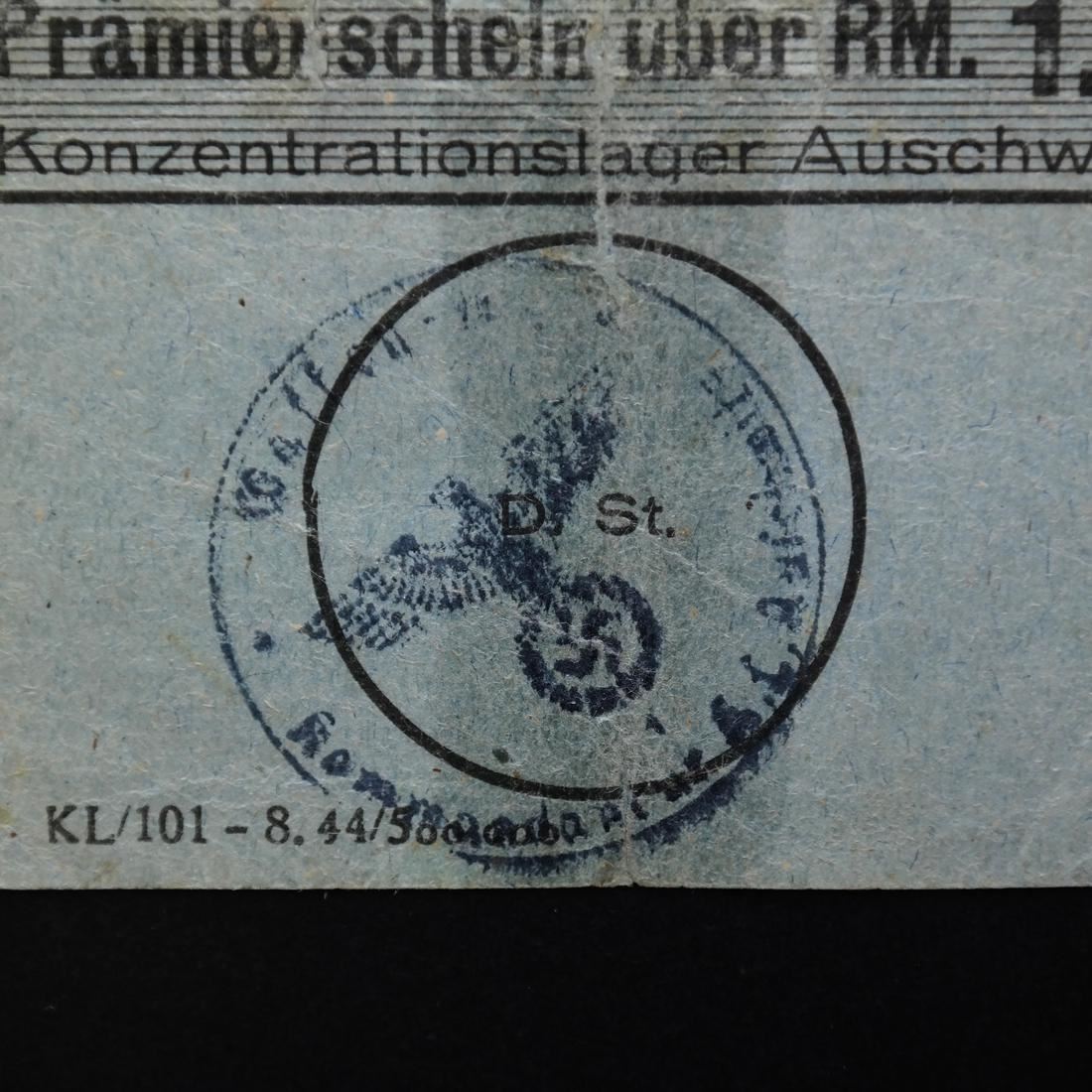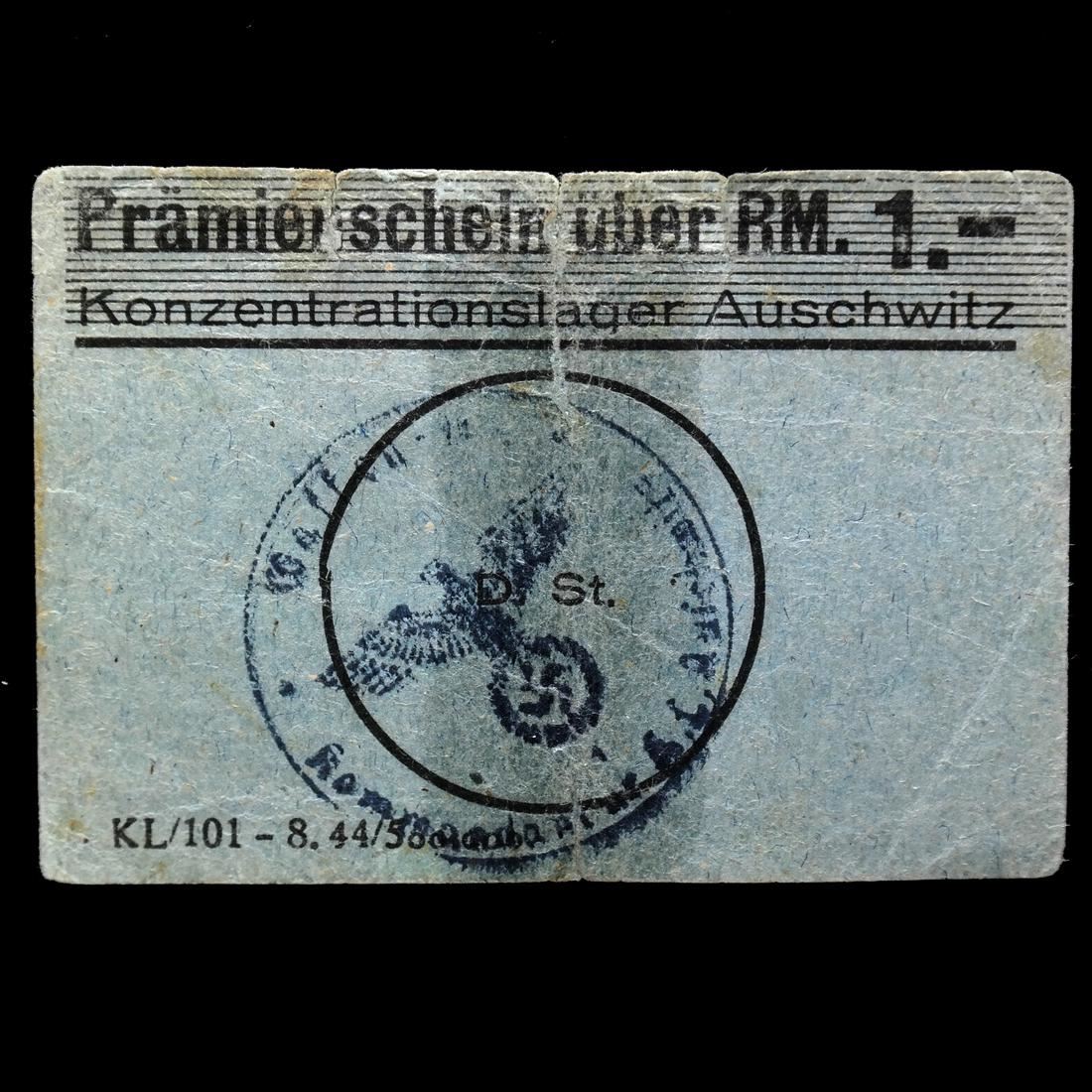 Prmienschein ber RM. 1.- / Konzentrationslager Auschwitz on grayish blue card paper with Waffen SS control handstamp, violet frauen=lager Birkenau boxed handstamp and pencil notations on reverse, measures approx 75 by 53mm, old tape reinforced vertical crease at center, some edge tears and wrinkling, Fine.