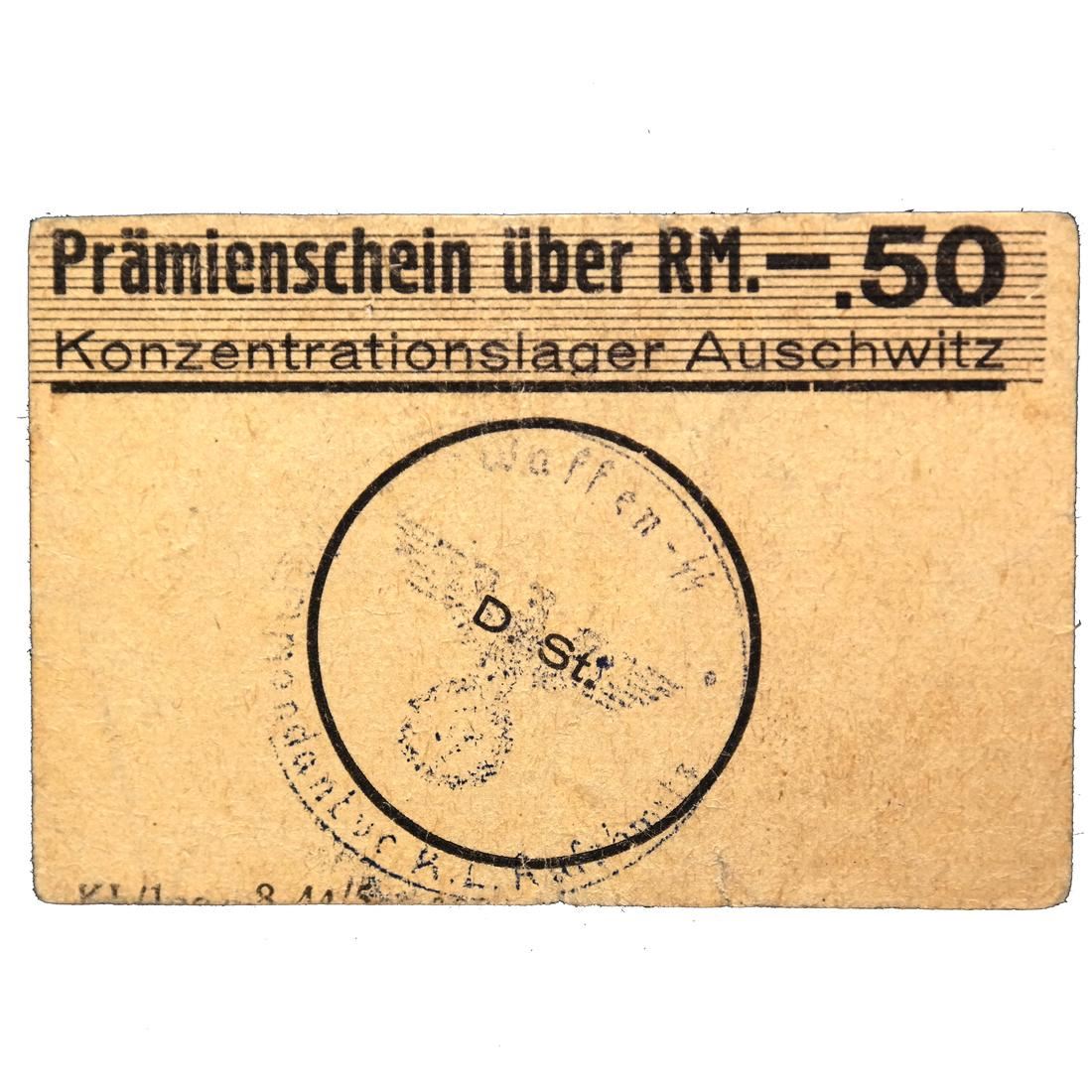 Prmienschein ber RM.-.50 / Konzentrationslager Auschwitz on cream card paper with Waffen SS control handstamp, measures approx 75 by 50mm, vertical center fold, small edge tear and slightly miscut, F-VF.
