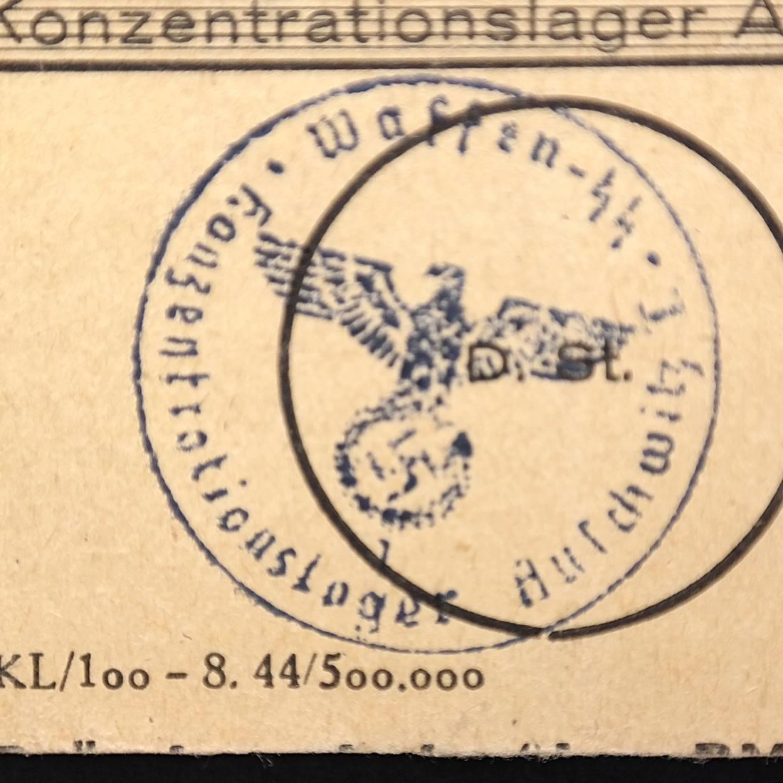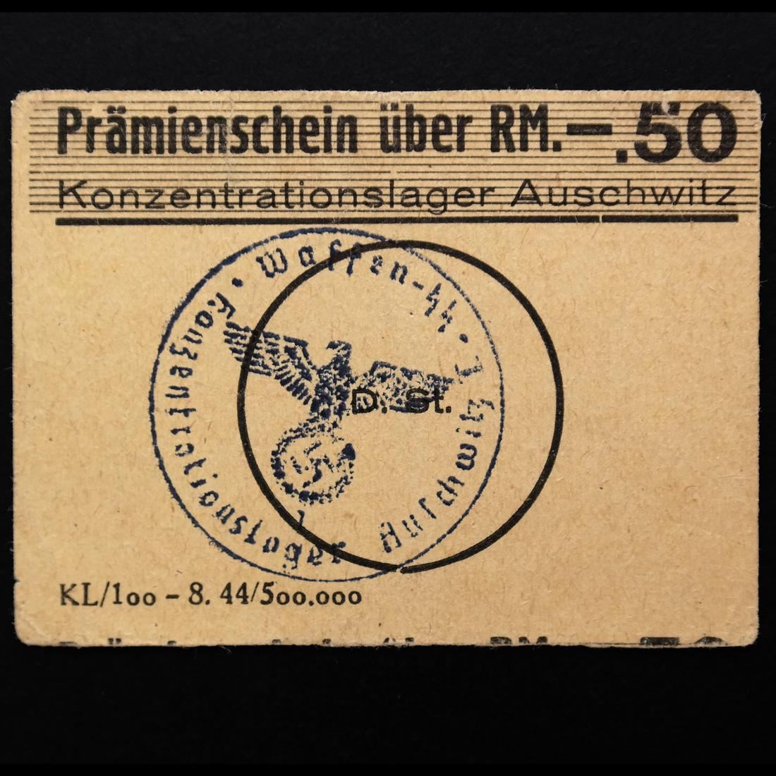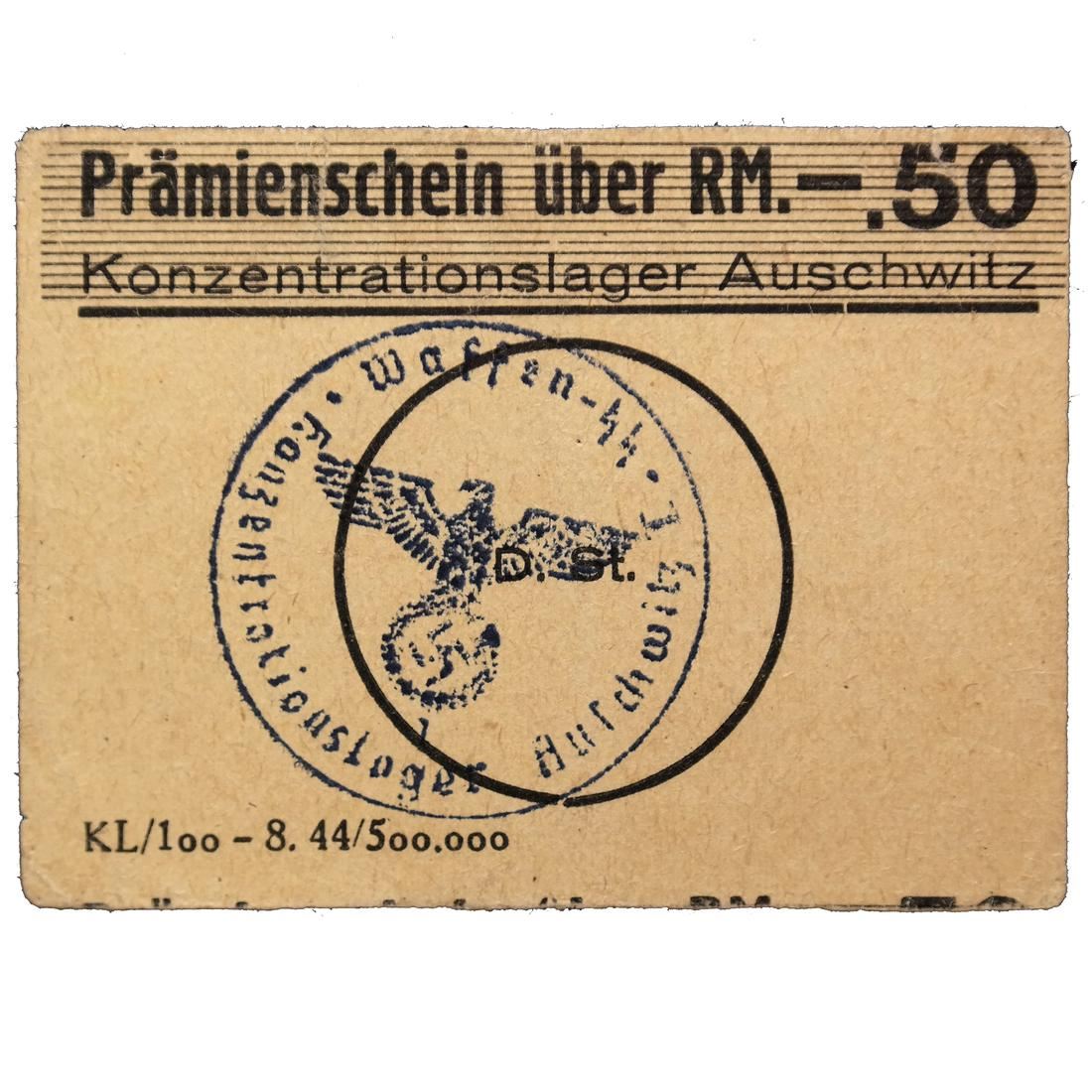 Prmienschein ber RM.-.50 / Konzentrationslager Auschwitz on cream card paper with Waffen SS control handstamp, measures approx 74 by 55mm, tear at top margin, F-VF.