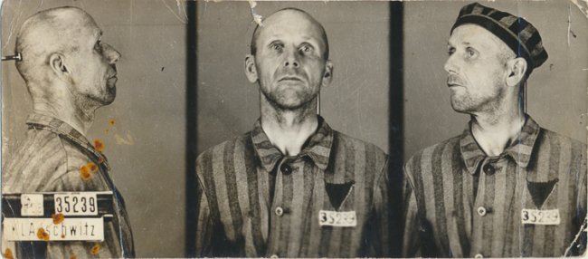 Auschwitz prisoner's file photo, three images on one 4 3/4" x 2" strip. Prisoner 35239 is a political prisoner whose fate is unknown. Some stains and edge wear.