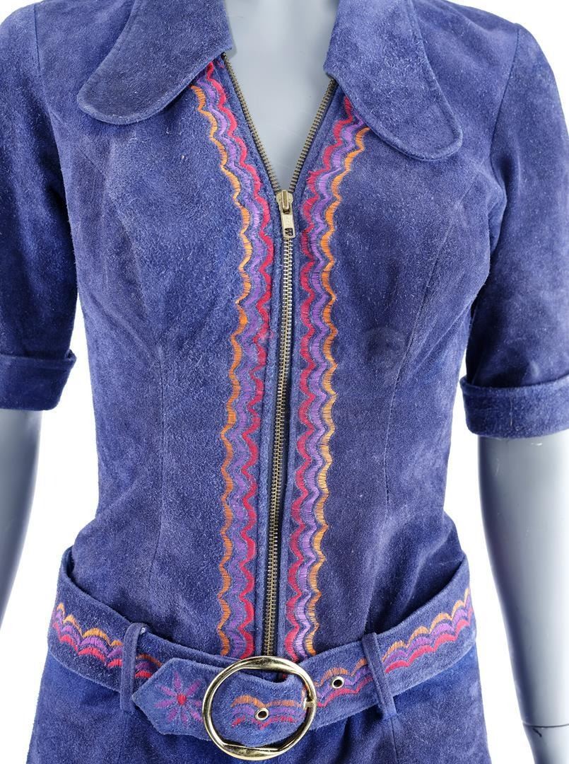 This lot consists of a royal blue suede romper with curved orange, purple, and red embroidery along the front, a matching belt with a goldtone metal buckle, and matching floral-patterned suede thigh boots with butterflies embroidered on the exteriors and half-zipper closures. The costume exhibits minor signs of discolouration and wear from production use and age, but it is in good overall condition.