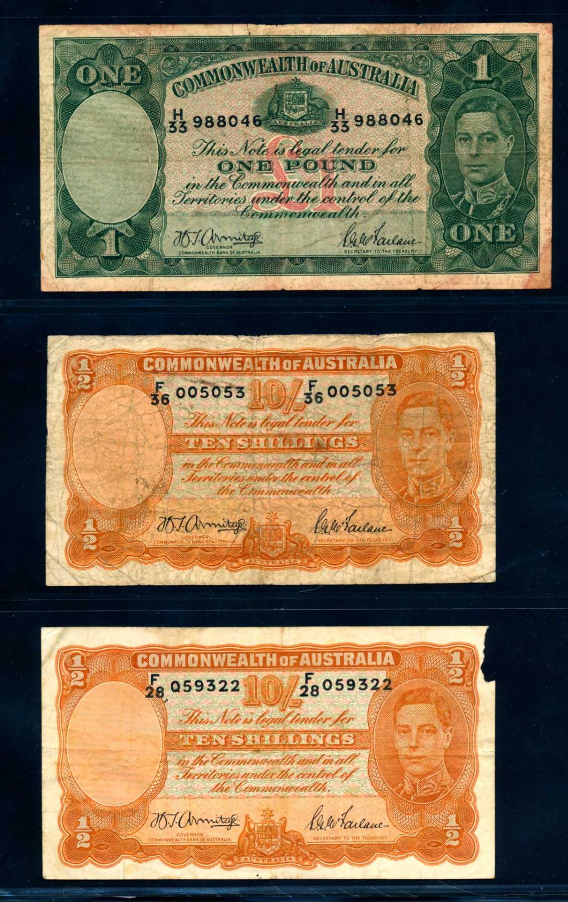 AUSTRALIA 1942 A Lot of 3 George VI Banknotes Very Good-Fine